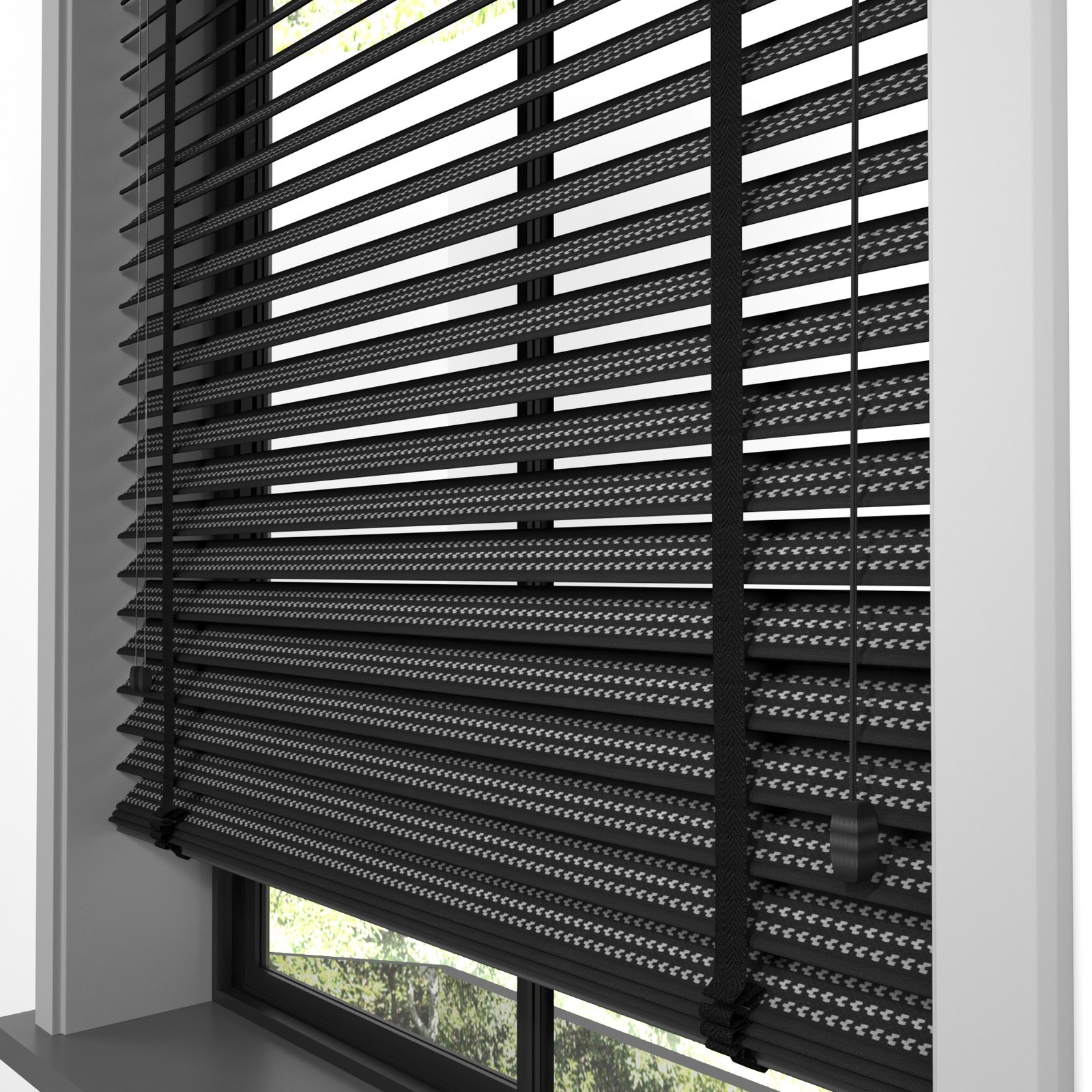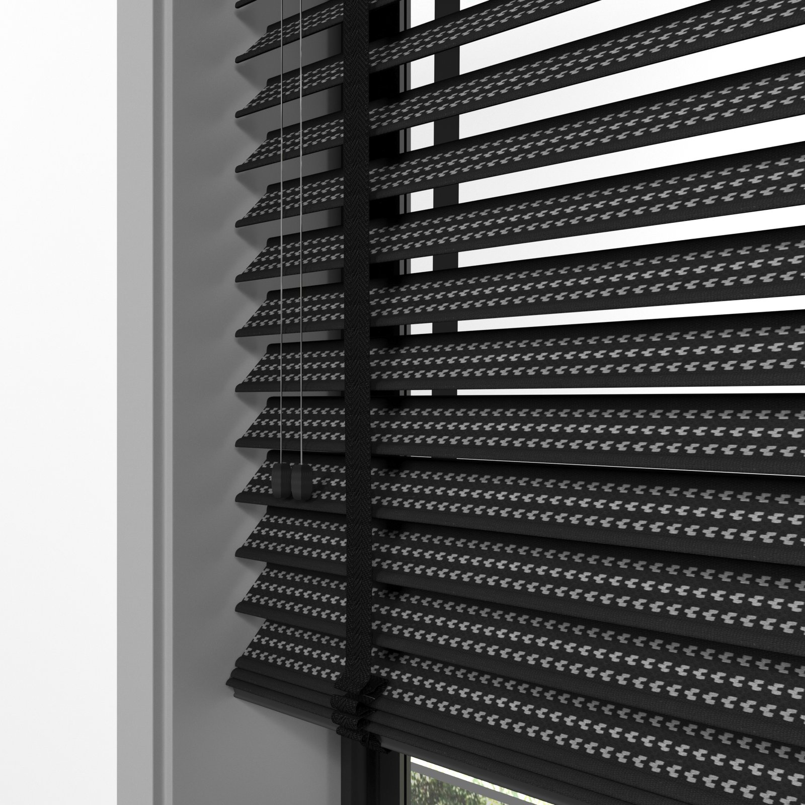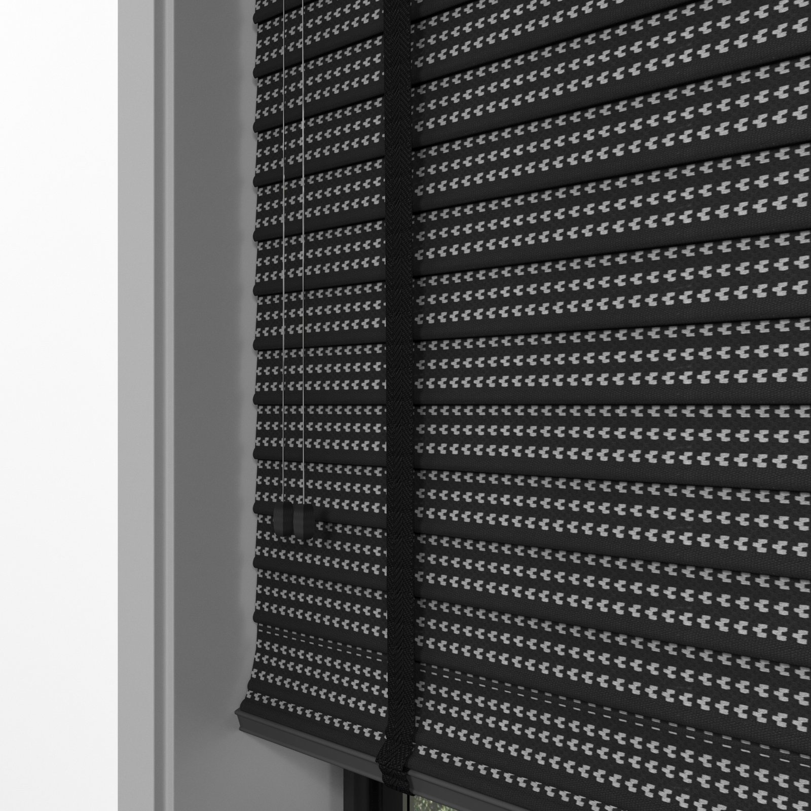 50 mm Hasır Gri Geometrik Şeritli Siyah Kumaş Jaluzi