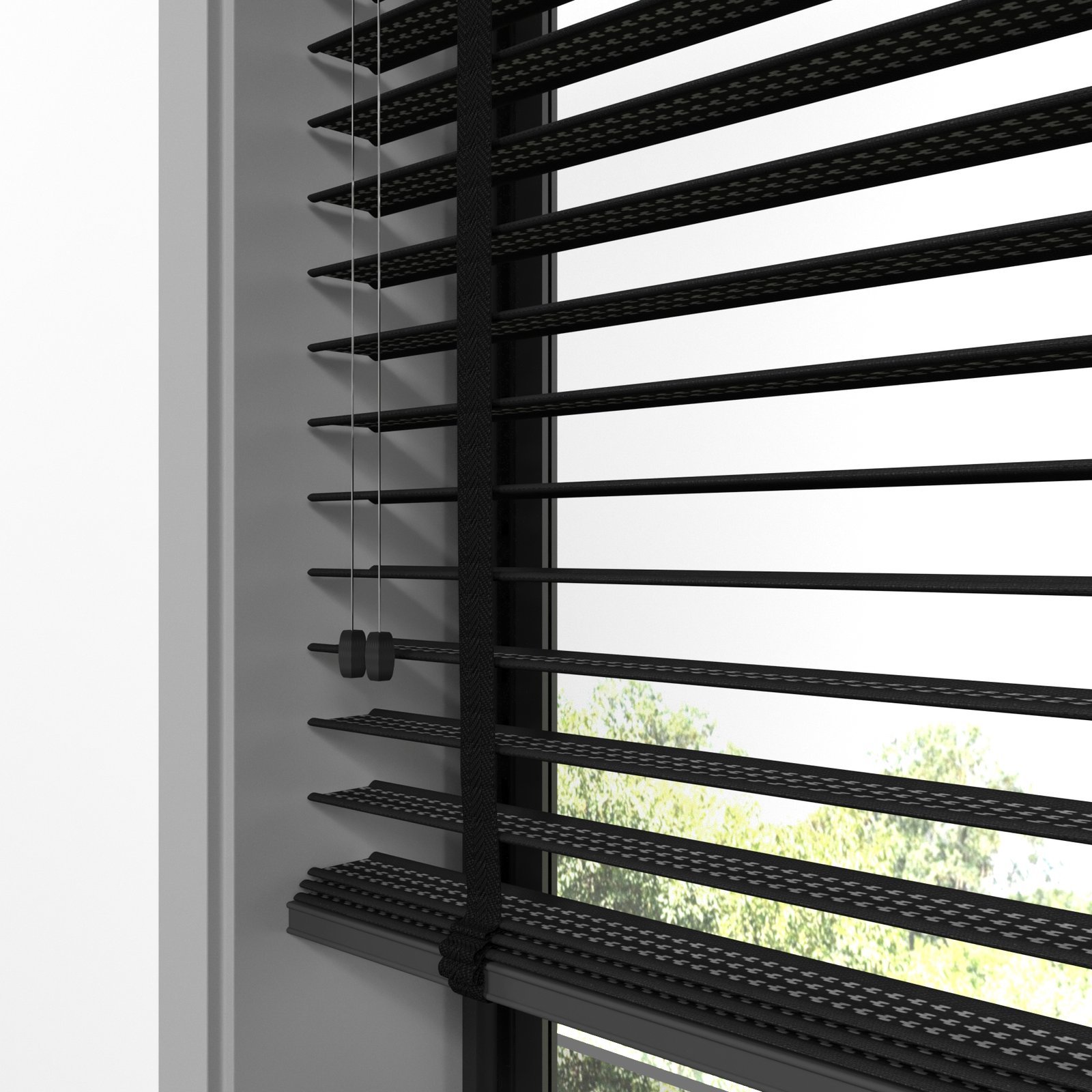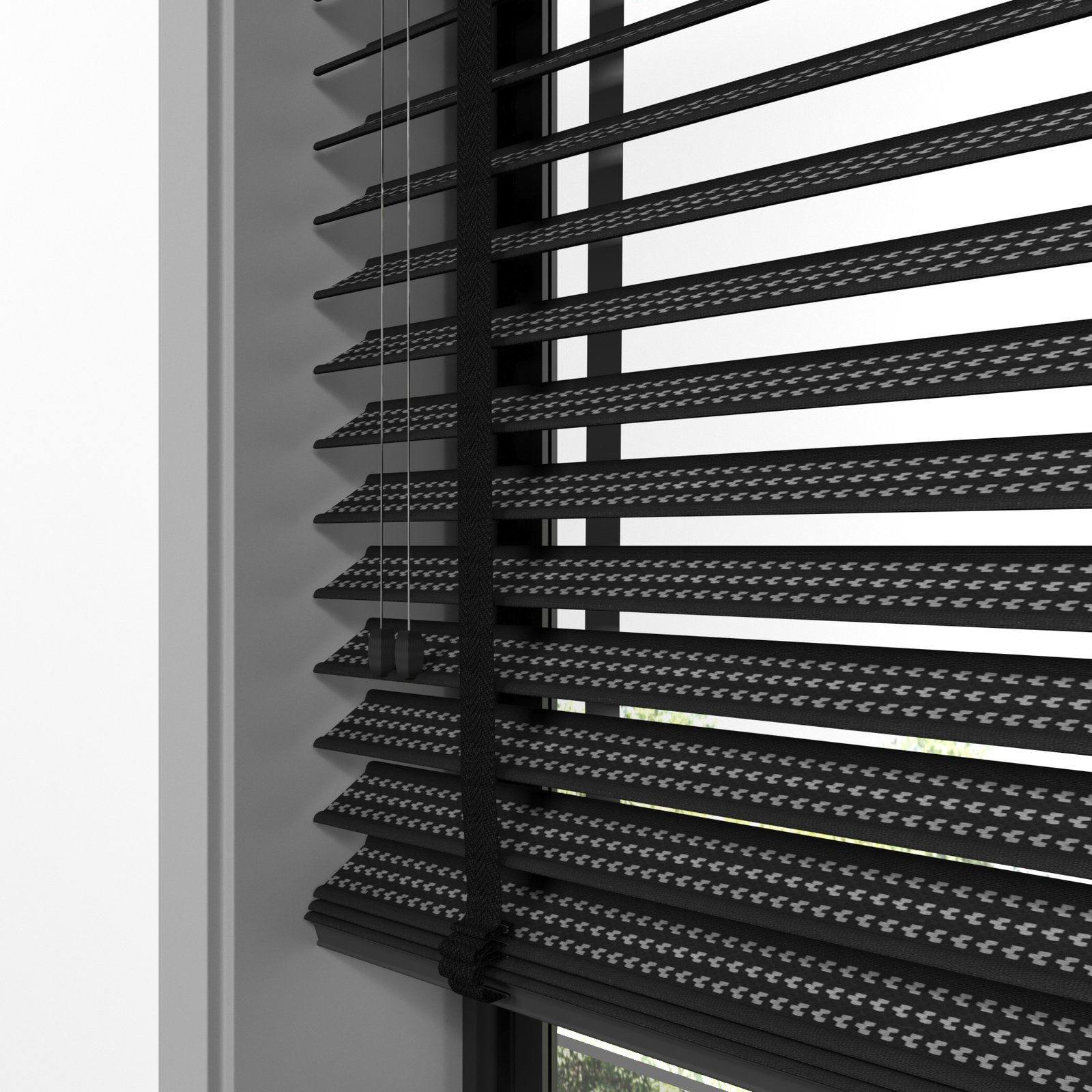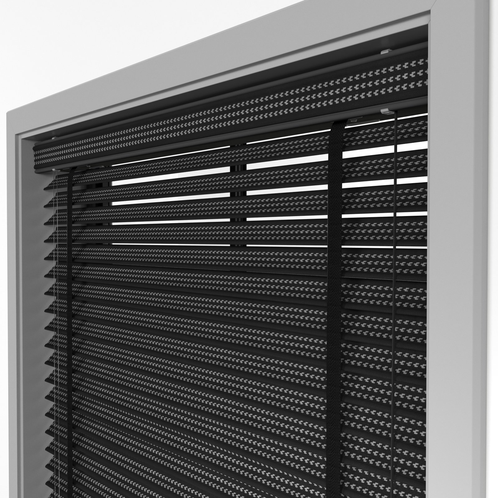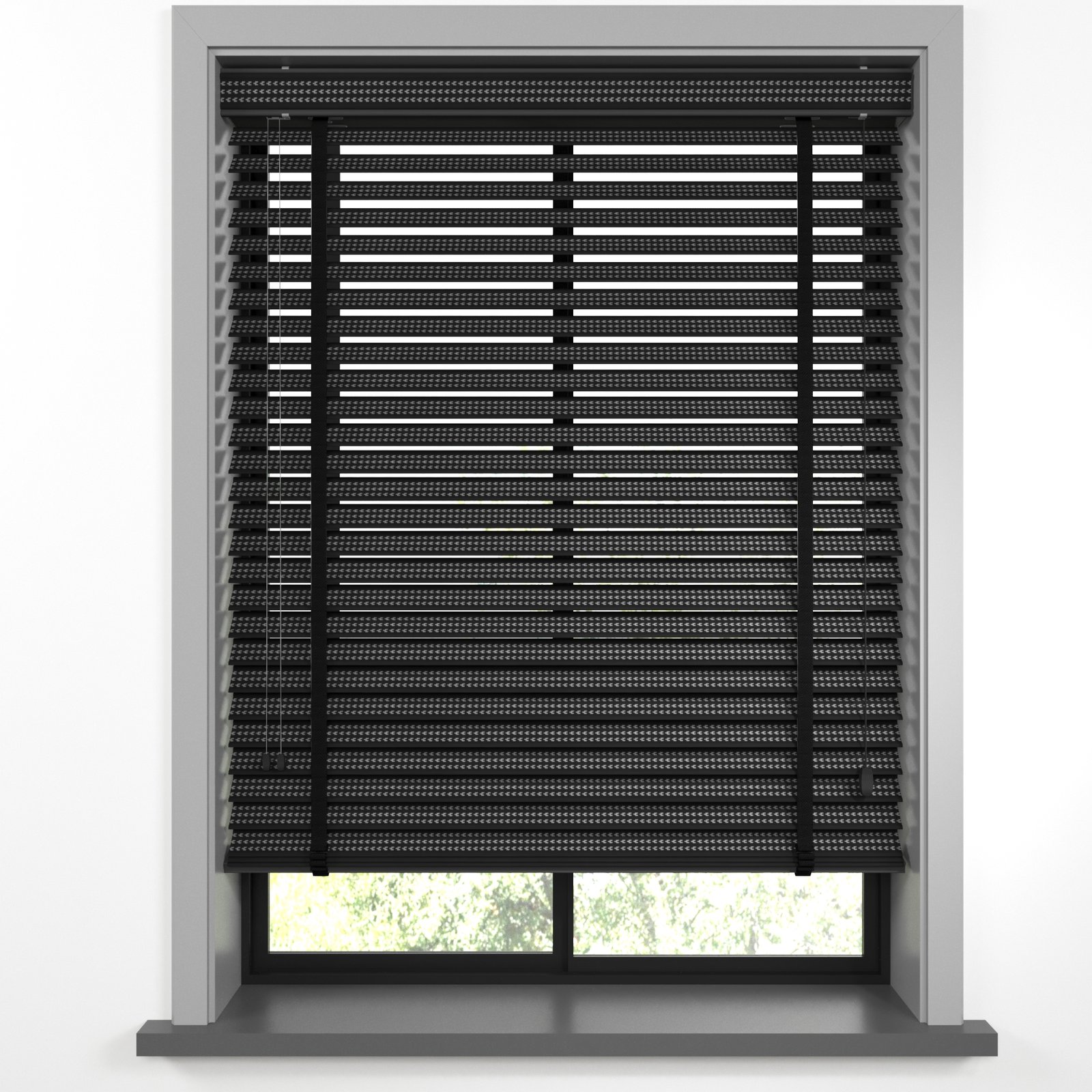 50 mm Hasır Gri Geometrik Şeritli Siyah Kumaş Jaluzi