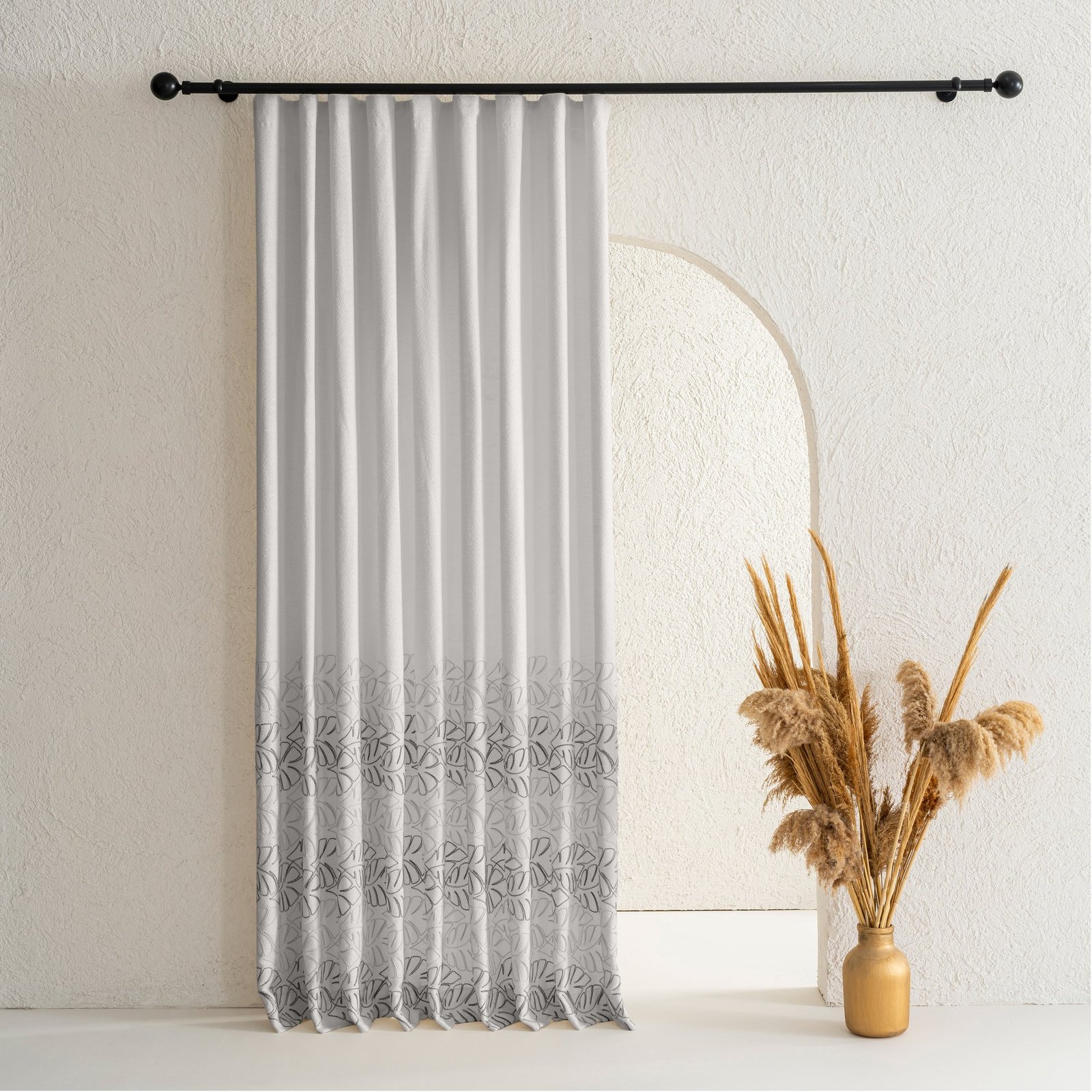 Gri zemin üzerine işlenen zarif nakış detayları, perdeye derinlik ve dokusal bir zenginlik katar. Kumaşın dökümlü yapısı cam önünde tok ve düzgün bir form sağlarken, ışığı kontrollü şekilde filtreleyerek salonlarda sakin ve şık bir atmosfer yaratır.