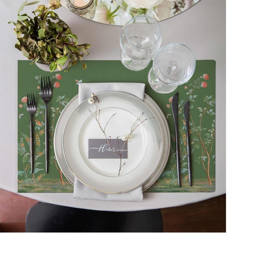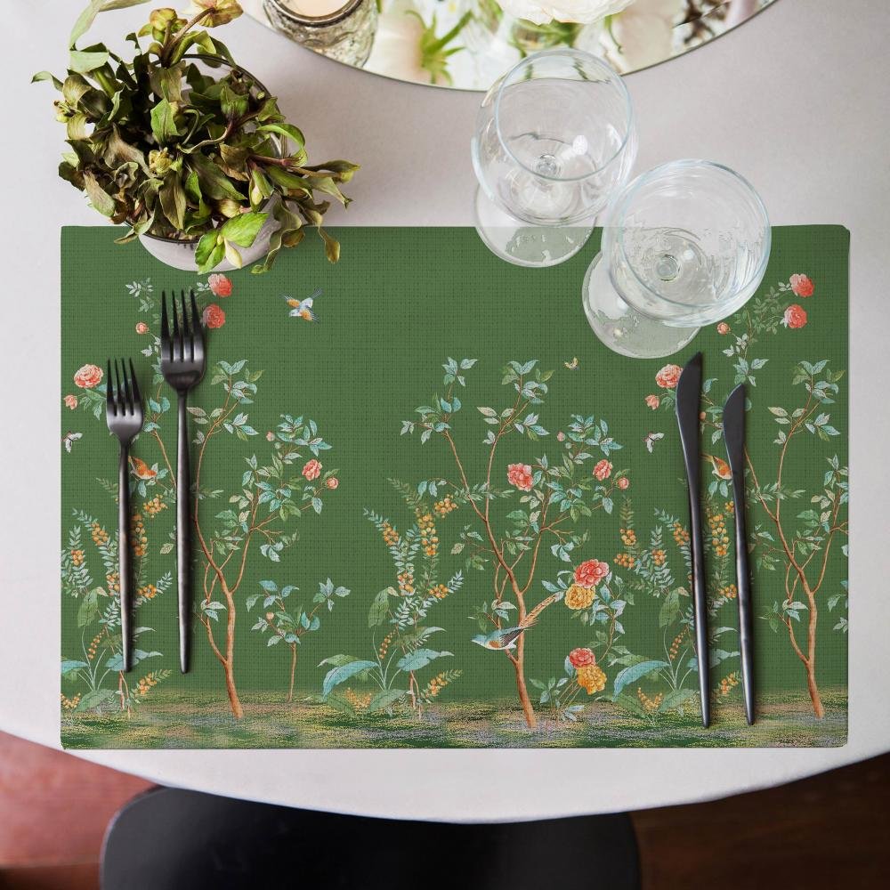 Nature Garden – Kuş ve Çiçek Desenli Yeşil Amerikan Servis Takımı- 4’lü Set (35X50 cm)