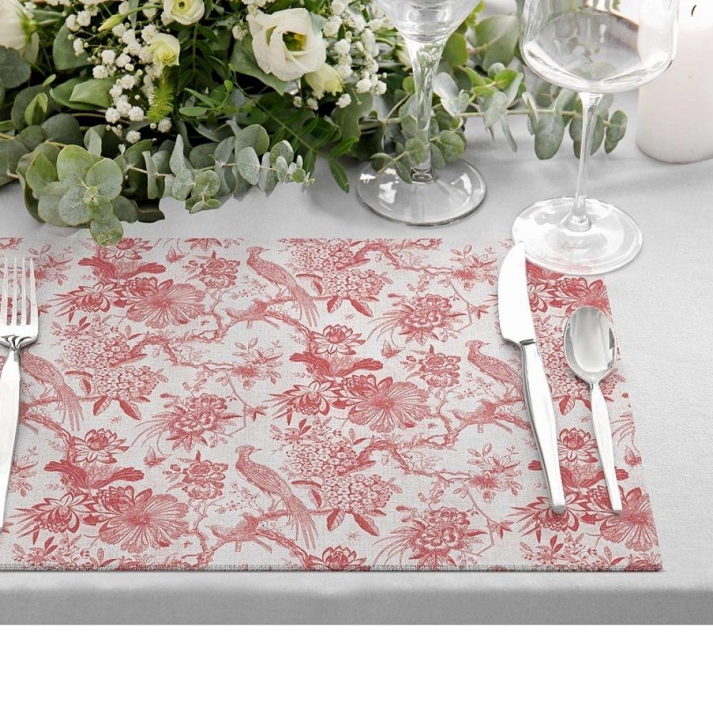 Romantik Desenli Kırmızı Kuş ve Çiçek Motifli Amerikan Servis Seti – 4’lü Set (30×50 cm)