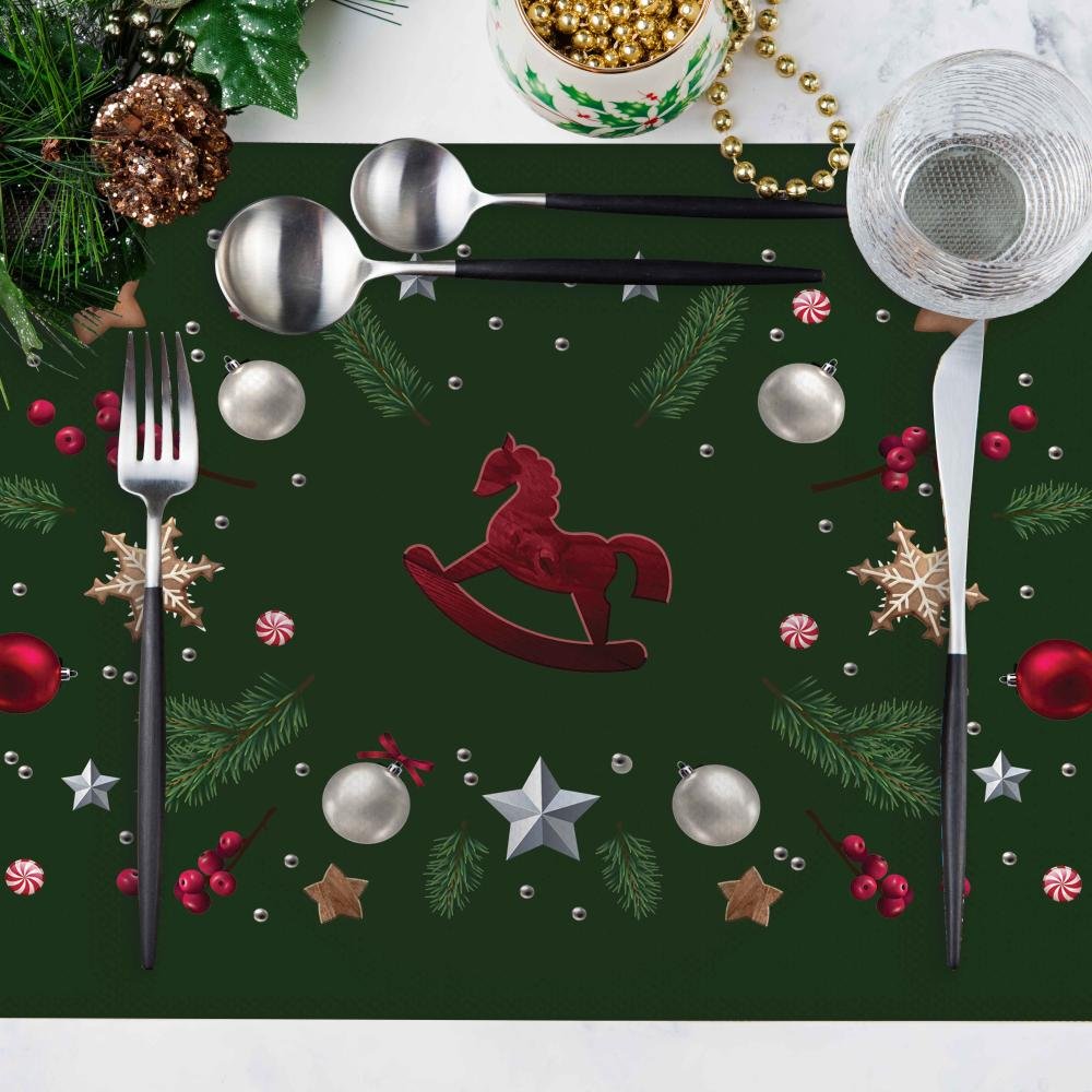 Sofrada Yılbaşı Şıklığı At Figürlü Çam Süslemeli Amerikan Servis – 4’lü Set (30×50 cm)